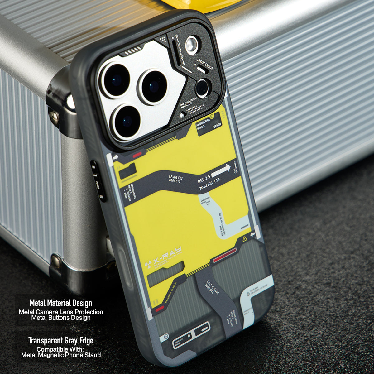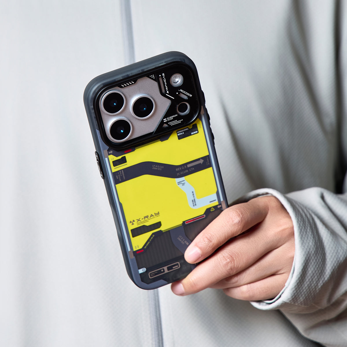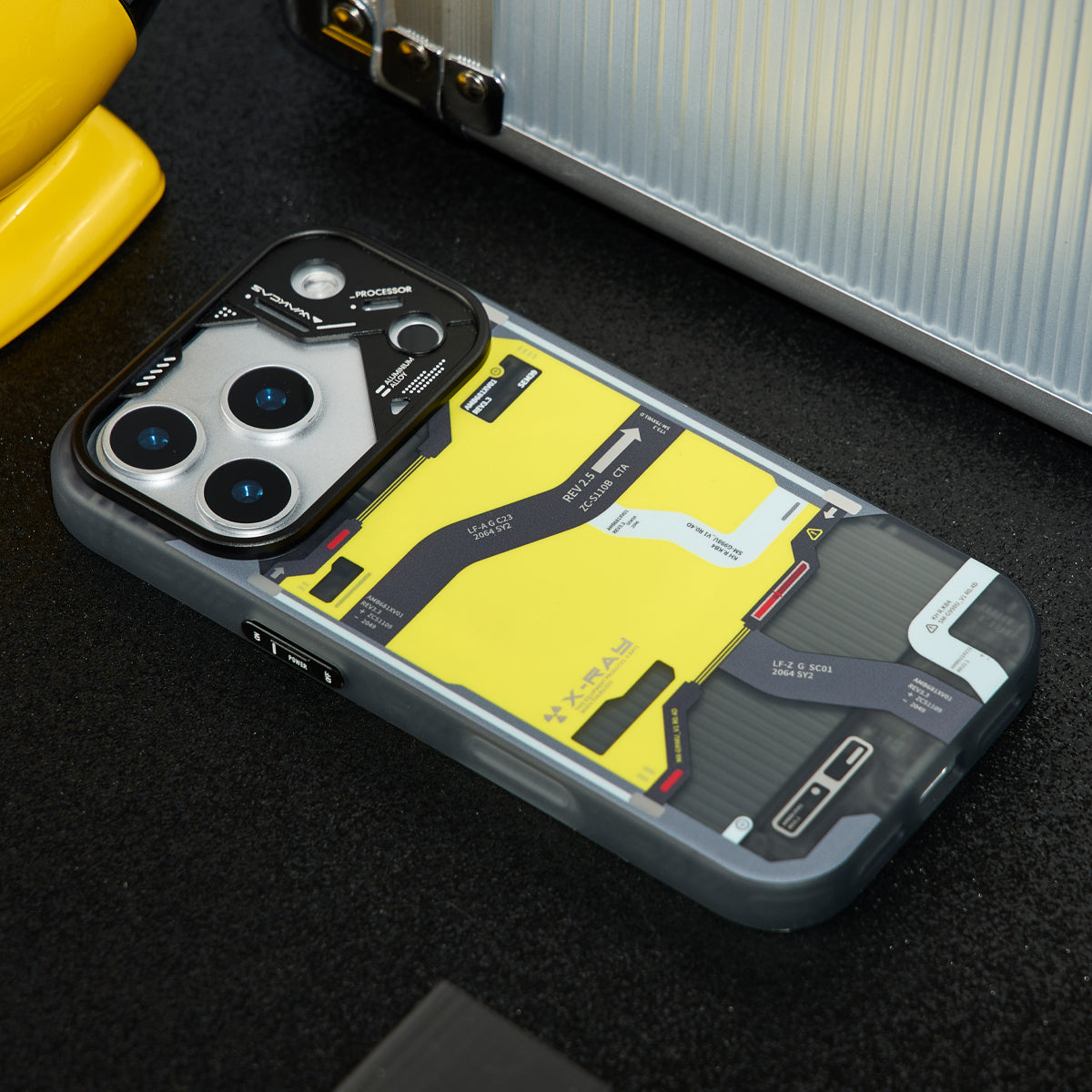 • Tactical-Inspired Graphics: The back panel features a high-contrast black, yellow, and gray pattern inspired by topographic maps and mechanical interfaces. Every angle reveals intricate details for a bold, tech-forward aesthetic.